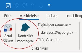 Det er muligt at sende mails til borgere i Outlook via. funktionen ”Send Sikkert”. Læs nærmere under ”Retningslinjer for anvendelse af mails og anden digital kommunikation”. For vejledning til at bruge ”Send sikkert” se længere nede under ”Vejledninger”.