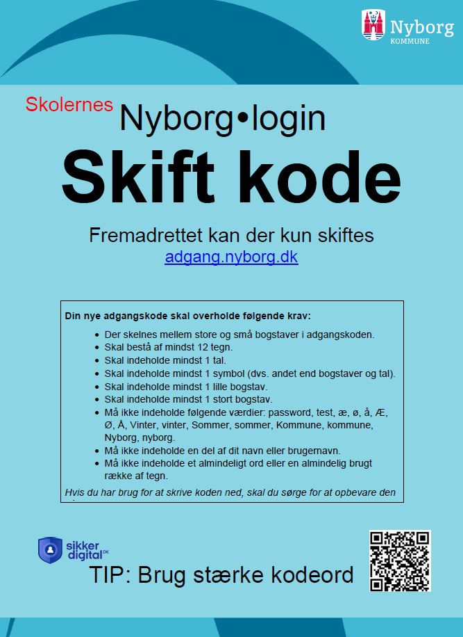 - Må ikke indeholde følgende værdier: password, test, æ, ø, å, Æ, Ø, Å, Vinter, vinter, Sommer, sommer, Kommune, kommune, Nyborg, nyborg.
