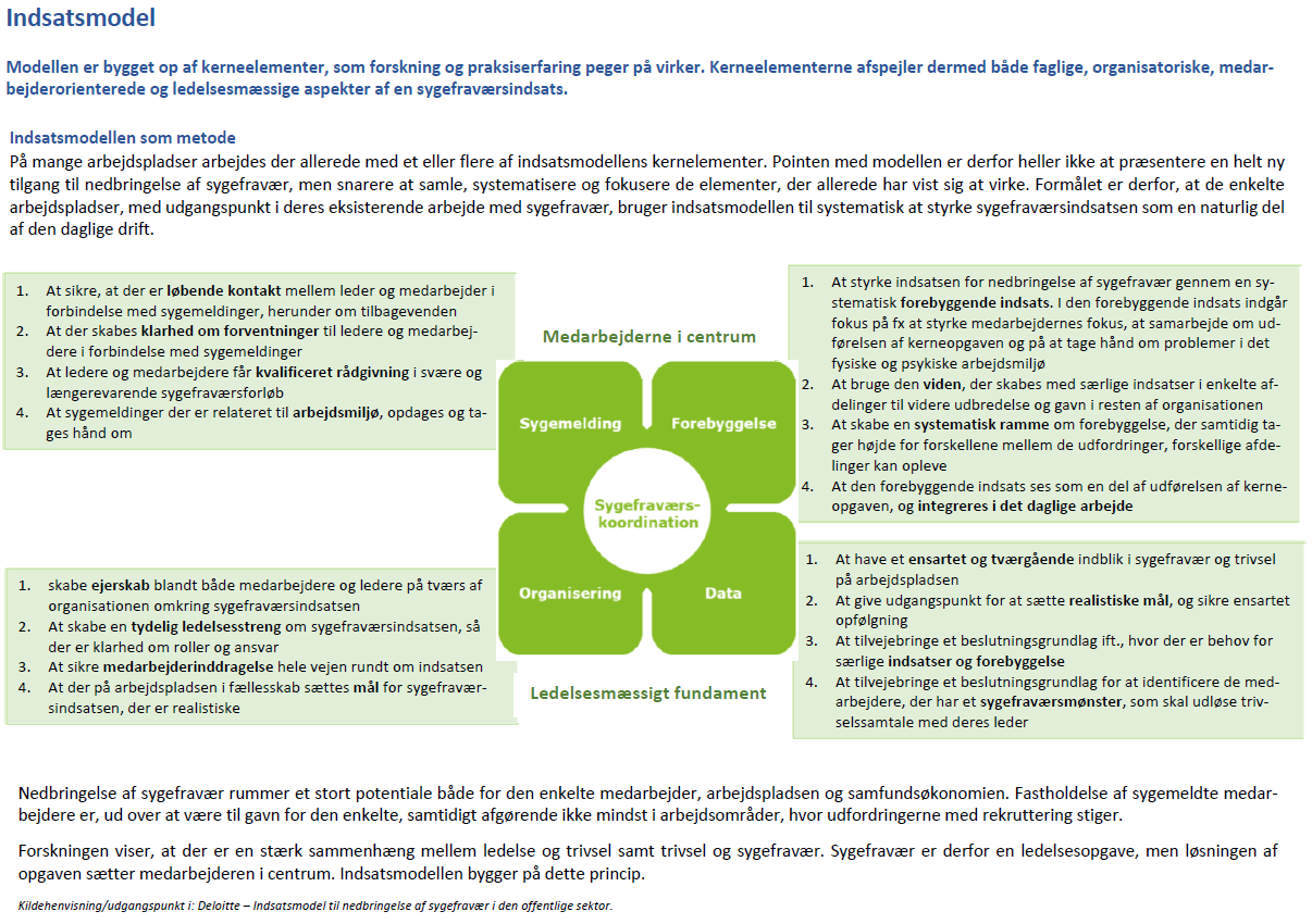 Indsatsmodellen er udarbejdet af Deloitte specifikt til nedbringelse at sygefraværet i den offentlige sektor