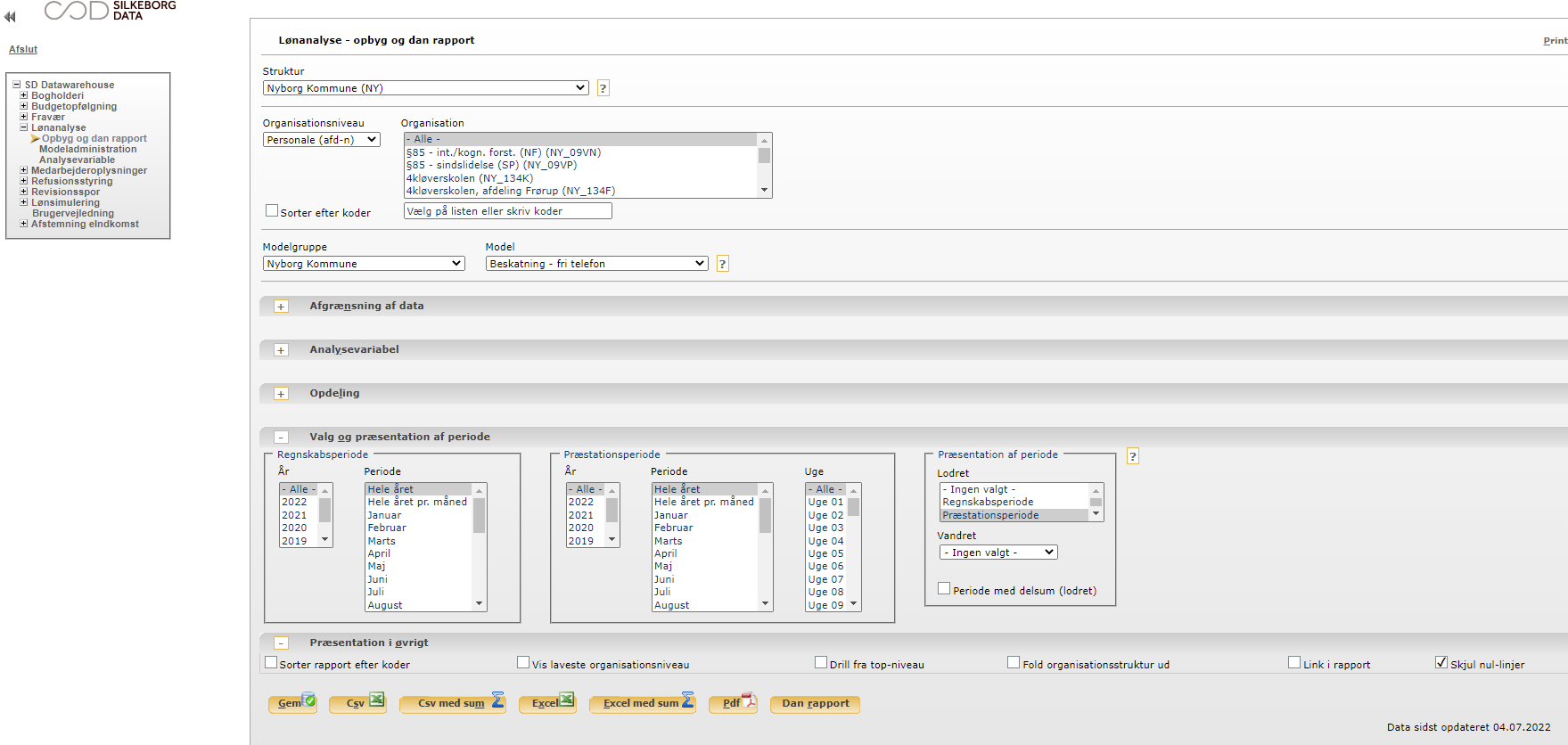 I SD Datawarehouse er dannet en model, som kan anvendes til denne kontrol. Under ”Lønanalyse” vælges: