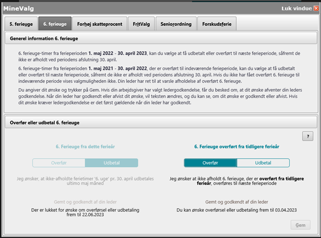 Har du ikke ønsket udbetaling, og ikke afholdt hele/dele af 6. ferieuge overføres saldoen automatisk til næste ferieår. Dette sker i lønkørslen medio maj.