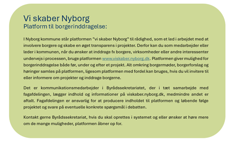 I Nyborg kommune arbejder vi med inddragelse på alle niveauer og på mange forskellige måder. Nogle afdelinger arbejder med store samskabelsesprojekter med involvering af mange civile aktører, mens andre afdelinger finder det mest oplagt at gøre brug af metoder hvor borgerne bliver hørt, men ikke direkte involveret.