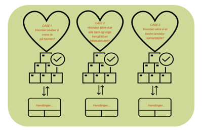 Et af de mest effektive redskaber i samarbejdet er at arbejde med såkaldte "hjertesager". En "hjertesag" er et område, hvor både kommune og civilsamfund har en fælles interesse og passion. Det kan være en specifik samfundsudfordring, som borgerne og de frivillige organisationer brænder for, eller et område, der er af særlig betydning for lokalsamfundet, såsom integration, sundhed, børn og unge, ældrepleje eller bæredygtighed. På disse områder kan man oprette aktionsgrupper, som samler aktører fra både kommune og civilsamfund for at arbejde målrettet mod løsninger. Nedenstående figur viser tre konkrete eksempler: