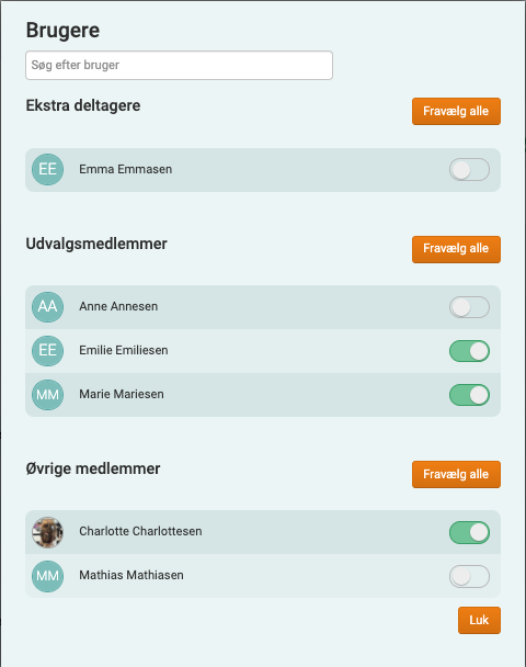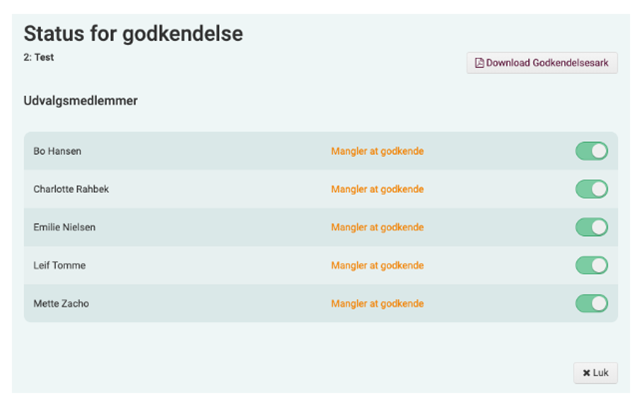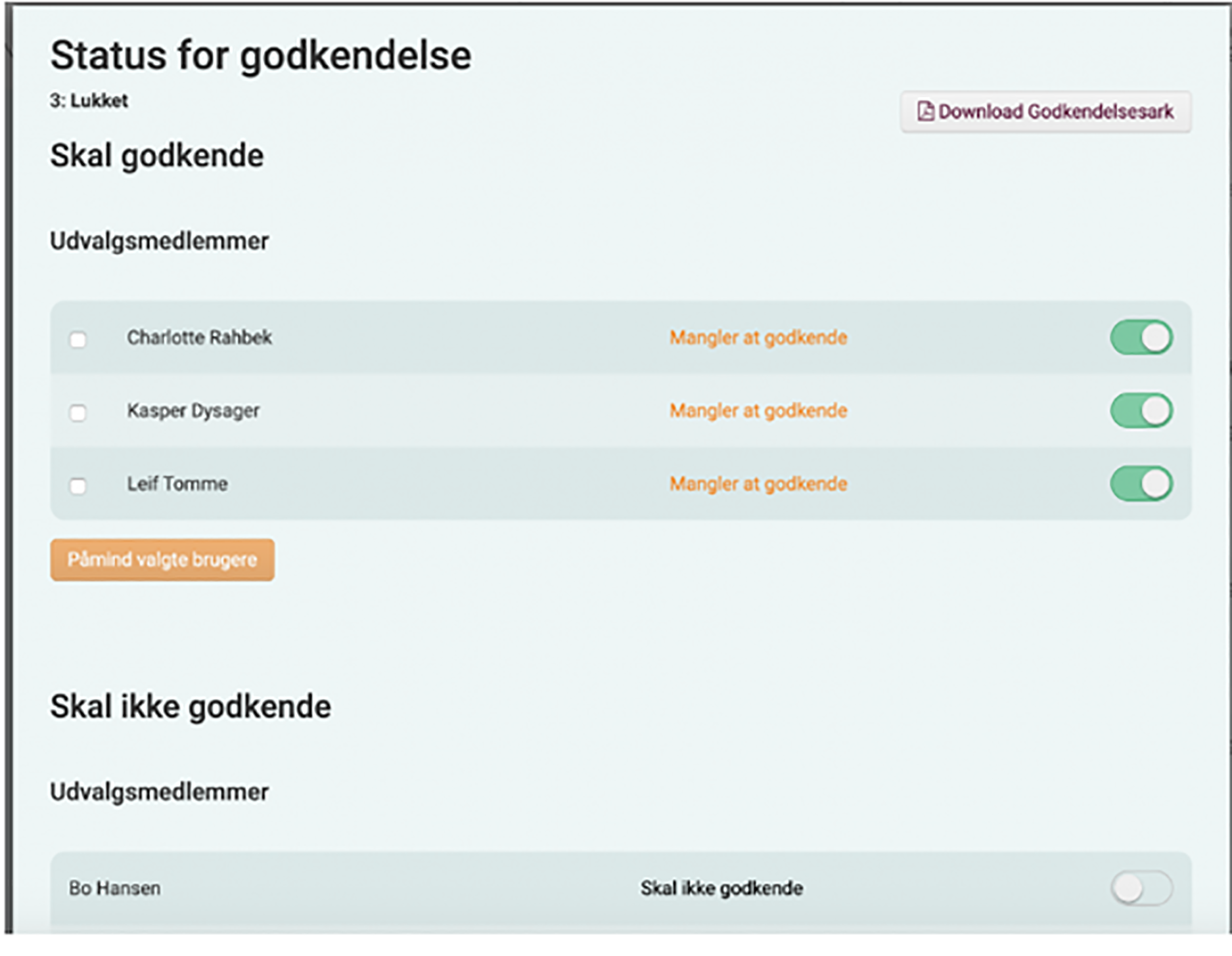 I eksemplet nedenfor er "Bo Hansen" udvalgsmedlem og sat som godkender, og hvis han på lige præcis dette møde alligevel ikke skal godkende, så deaktiverer du den blå indstillingsknap. Ændringerne slår igennem øjeblikkeligt.