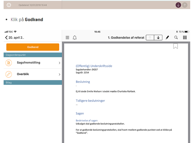 - Indhold/sagsfremstilling med tekst: Udvalget skal godkende beslutningsprotokollen. For at godkende beslutningsprotokollen, skal hvert medlem underskrive ved at trykke på Godkend.
