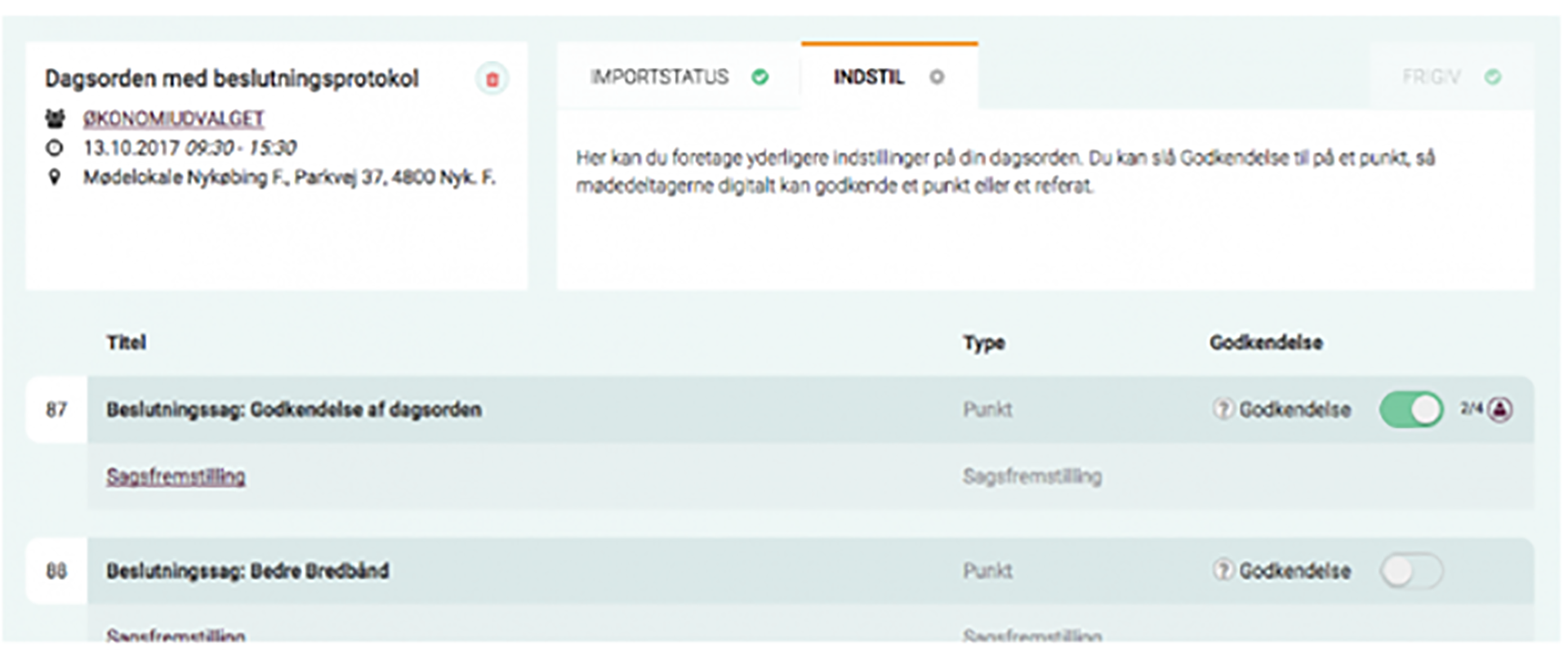 - Vælg din dagsorden (husk "Tillad godkend" skal være aktiveret i udvalget, før at du kan indstille et dagsordenpunk til godkendelse)