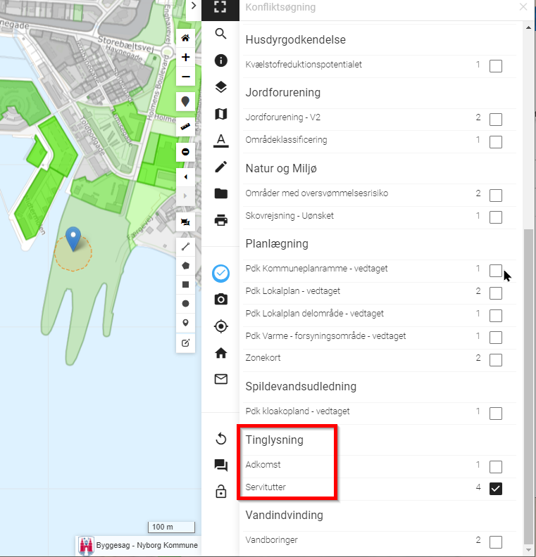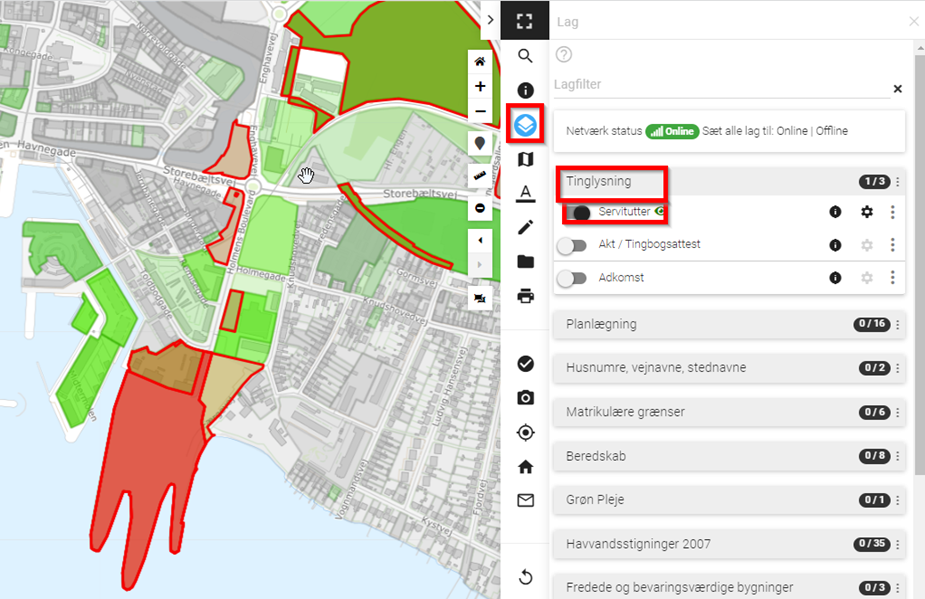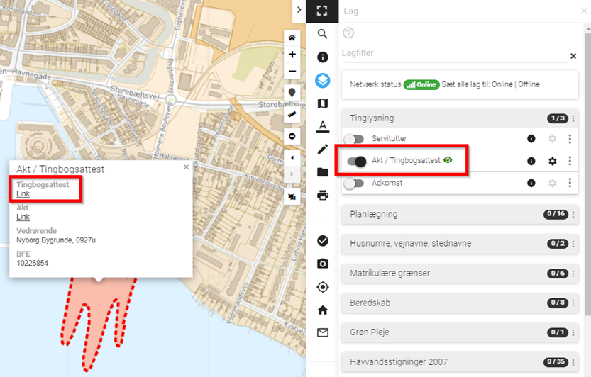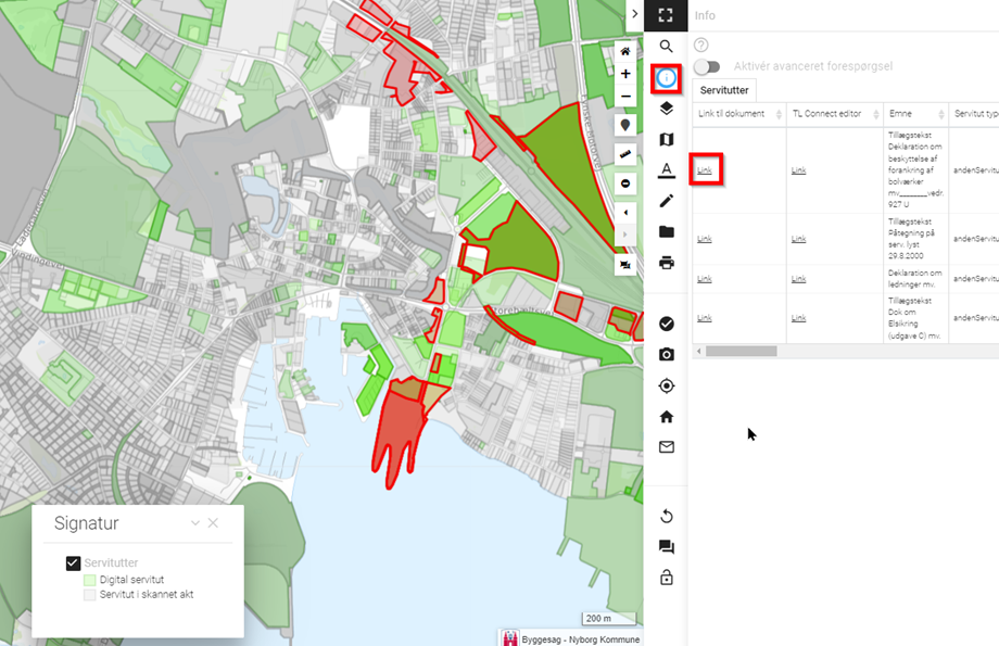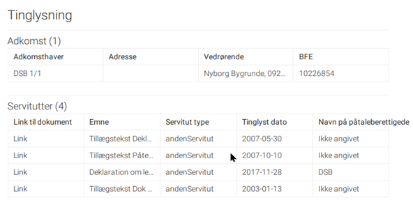 Alle servitutter der er til rådighed, er refereret til et kort, hvor der er link til servitutten. Hvis det er en ældre servitut (før sept. 2009, linkes til en akt – ellers linkes til den digitale servitut.