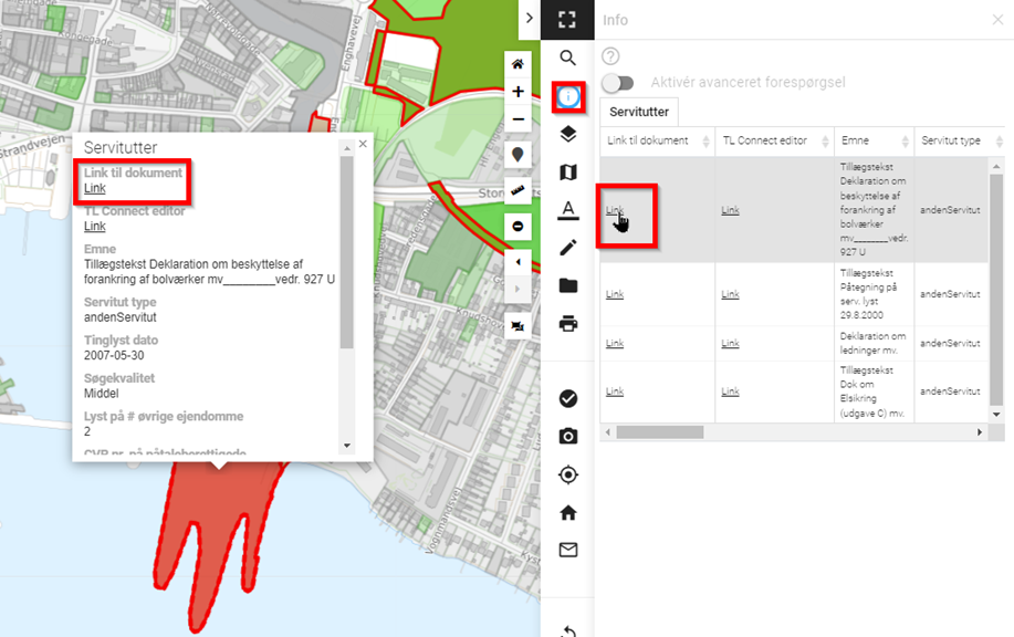 Oplysninger om servitutten ses i Info-boksen eller i Info-vinduet