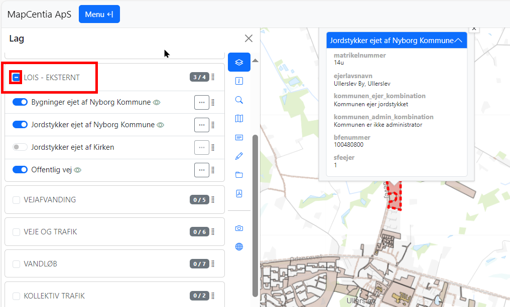 - LOIS - Eksternt - består indtil videre af 4 dataviews: Ejendomme og bygninger ejet af Nyborg Kommune, Offentlige vejarealer og Ejendomme ejet af Kirken. Hver nat kopieres disse LOIS-views til ’nyborg_gis’, som er en opdateret PostGreSQL-database. Da det ikke indeholder personfølsomme data, kan det også tilgås eksternt. Således kan kollegaer i Driften, borgere og samarbejdspartnere anvende disse data og kort.