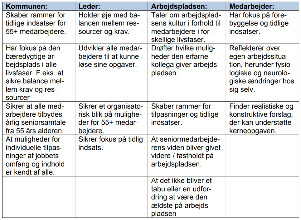 Som udgangspunkt skal der senest fra 55-årsalderen gøres en særlig indsats for at tilrettelægge medarbejderens arbejdssituation på en sådan måde, at det både bliver til medarbejderens og arbejdsstedets fordel. I de fleste tilfælde vil der formentlig ikke være behov for egentlige ændringer, hvorimod der i andre tilfælde kan være behov for eller ønske om lavere timetal, en anden stilling, forebyggelse af fysisk eller mental nedslidning eller andet. Ved tidlige indsatser kan vi ofte forebygge situationer, hvor medarbejder ikke kan holde til at arbejde længere.