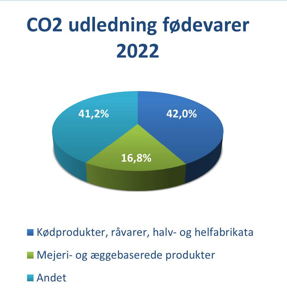 I 2022 udgjorde kød, æg- og mejeriprodukter ca. 58,8 % af CO2-udledningen fra fødevareindkøb, hvoraf 250 ton stammer fra okse- og kalvekød og 147 ton fra mejeri- og æggebaserede produkter.
